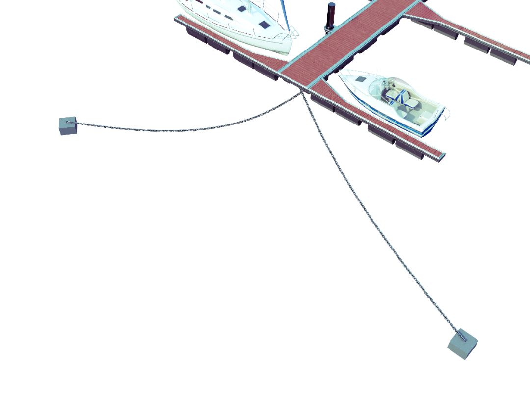Традиционный способ крепления понтонов с помощью якорных замков, стальной цепи и бетонных якорей.