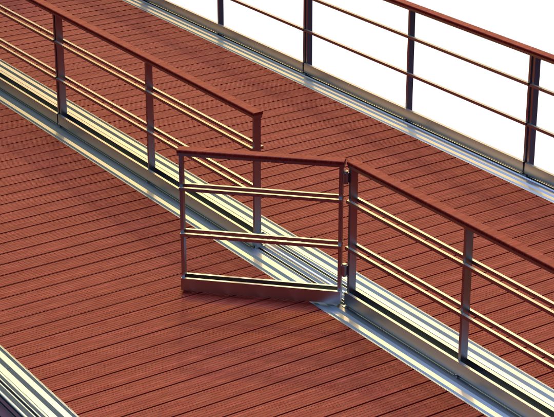 Трапы оснащаются роликовыми системами скольжения по понтонам и сходнями для плавного спуска на понтоны, что позволяет без труда пользоваться ими маломобильным группам