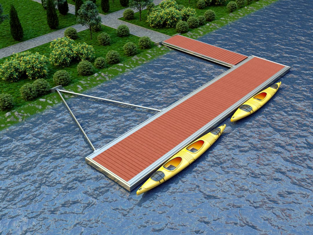 Запатентованная конструкция профиля Alumarina позволяет устанавливать на него перильные ограждения и использовать понтоны как плавучие набережные или наплавные мосты.